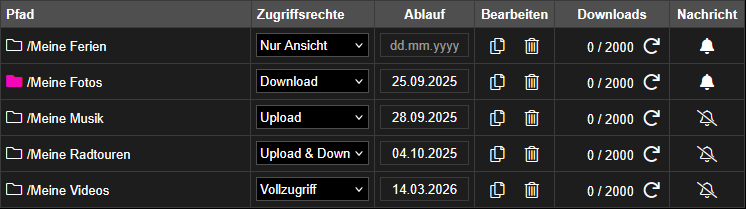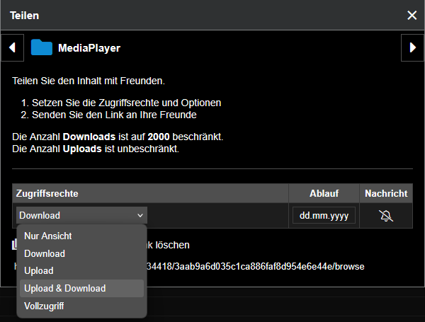 In dieser Übersicht können Sie geteilte Links löschen, die Anzahl Downloads einsehen und diese bei Bedarf auf 0 zurücksetzen.